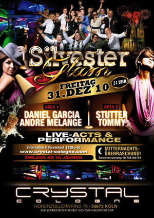 Eintritt: VVK 15,- AK: 20,- Vorverkauf: TICKETS HIER ONLINE // Doubleight Köln (Ehernstr 65 - Köln) // CRYSTAL (Hohenzollernring 79 - Köln) an Veranstaltungstagen SILVESTER GLAM ist der Auftakt in ein fantastisches neues Jahr 2011. Wir verabschieden uns vom vergangenen Jahr und läuten das neue mit einer glamourösen Silvesternacht ein. Wir lassen nicht einfach nur die Korken knallen, sondern auch den Champagner fließen! Eine edle Location, schicke Gäste und spektakuläre Highlights machen die wichtigste Party des Jahres für euch zu etwas ganz besonderem. Dieses einzigartige Event wird selbstverständlich in einem luxuriösen Club gefeiert. Das Crystal wird seinem Namen mehr als nur gerecht. Diese glanzvolle Location bietet seinem anspruchsvollen Publikum königliche Unterhaltung. Viele Specials erwarten euch am 31 Dezember. Freut euch auf die musikalische Darbietung von Mike Leon Grosch, auf fantastische Performances und natürlich eine explosive Mitternachtsüberraschung. Es wird eine unvergessliche Silvesternacht!